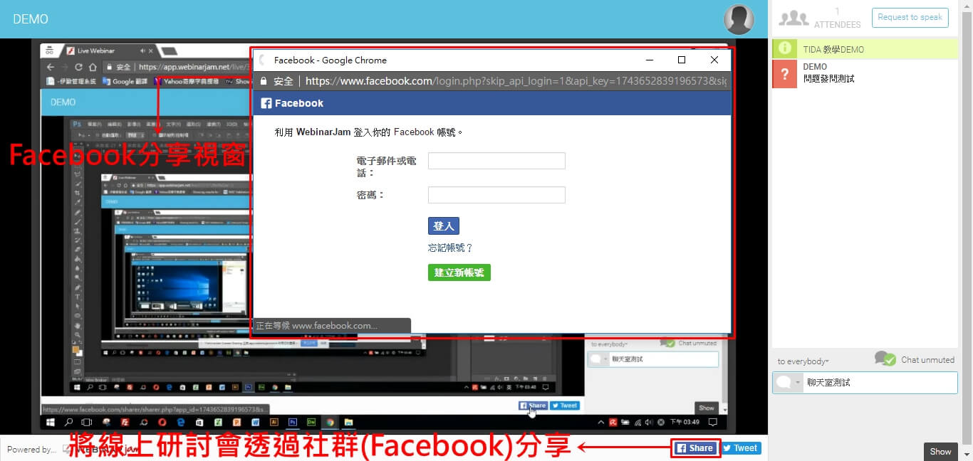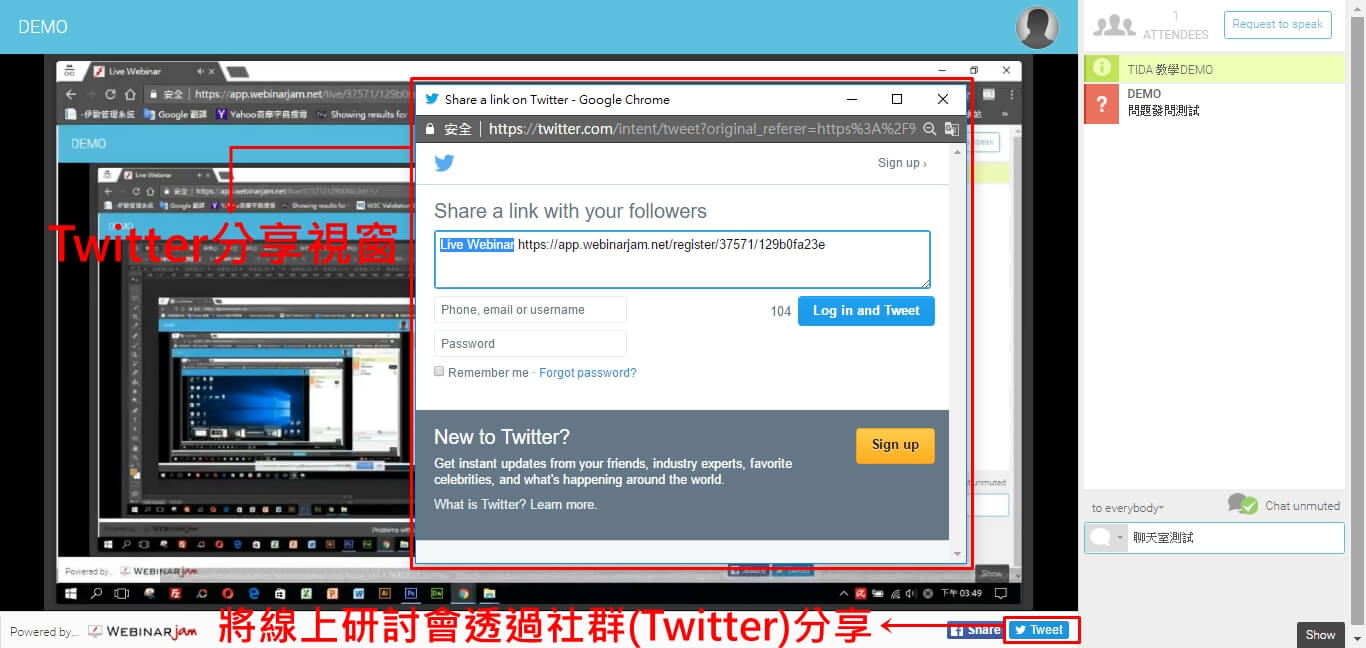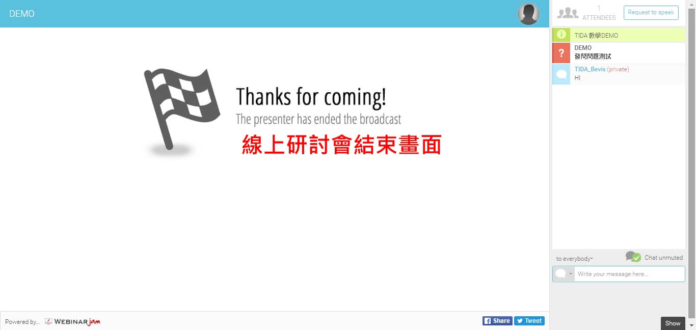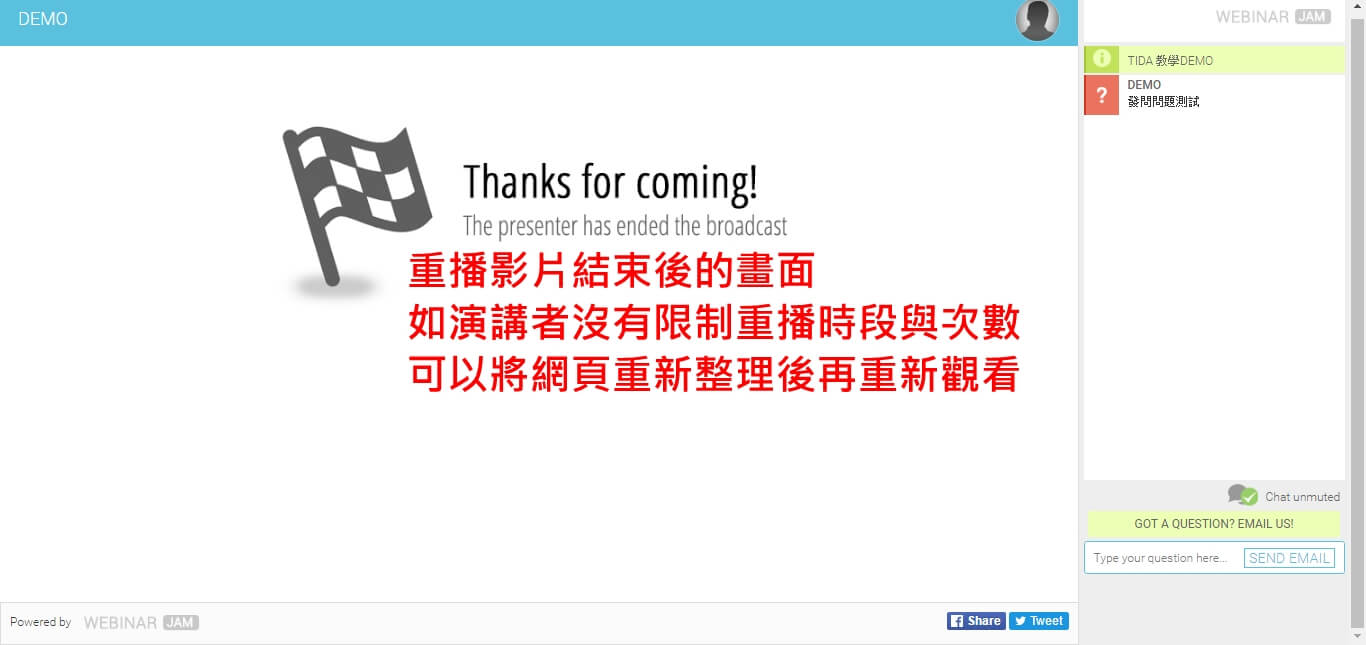線上研討會可透過社群媒體分享(Facebook) 線上研討會可透過社群媒體分享(Twitter) 當研討會結束,演講者關閉直播時畫面呈現(如下圖) 線上研討會結束後,如演講者有設定重播,觀眾會收到重播連結的E-mail(依照不同演講者的設定,會有不同的重播次數、時段,亦有可能沒有重播)重播時無法使用聊天室功能,如在重播時遇到問題可使用Email的方式詢問(1) 重播結束後畫面(如下圖)如果演講者沒有限制重播的次數或時段,在重播結束時重新整理頁面即可再次觀看